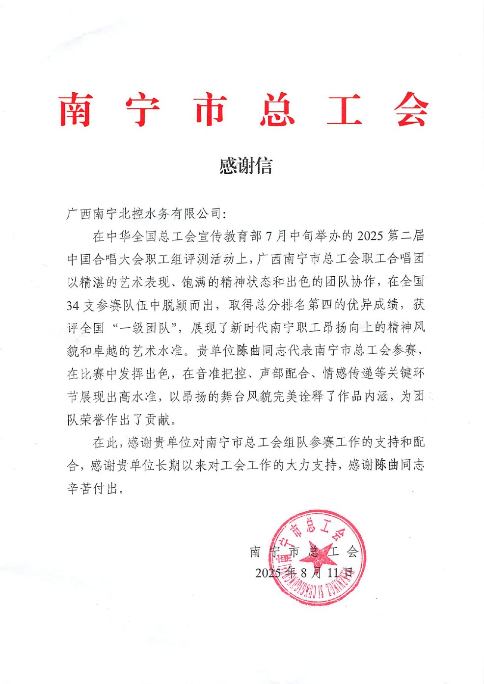 廣西南寧北控水務(wù)有限公司獲南寧市總工會致信表揚2025-08-25